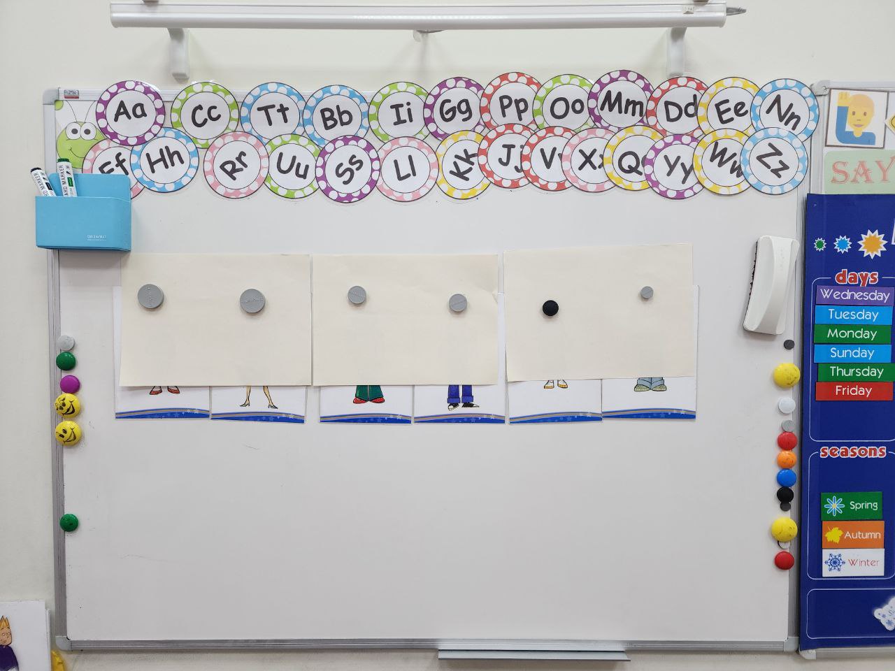 🔟 Прикрепите карточки на доске магнитом. Дети выходят к доске и подписывают карточки. Если слова сложные, то можно написать слова, пропустив некоторые буквы в них. В таком случае дети тогда смогут дописать маркером недостающие буквы.